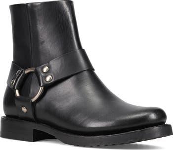 A moto-style harness lends rough-and-ready edge to a handcrafted leather bootie made with a Goodyear welt and flexible sole for durability and comfort.