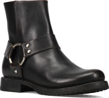 A moto-style harness lends rough-and-ready edge to a handcrafted leather bootie made with a Goodyear welt and flexible sole for durability and comfort.