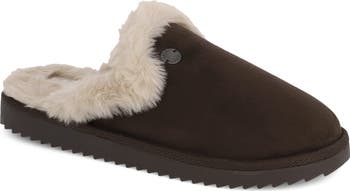 Fluffy faux-fur lining warms an easy-on mule set on a grippy sole for indoor/outdoor wear.