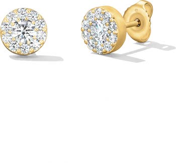 A solitaire diamond is haloed with even more diamonds to create these icy round stud earrings set in 18-karat gold.