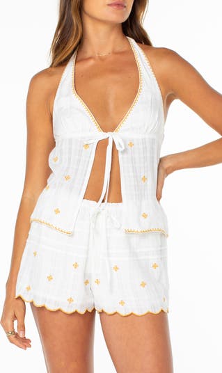 Dainty floral embroidery adds the perfect pop of retro style to this breezy halter top.