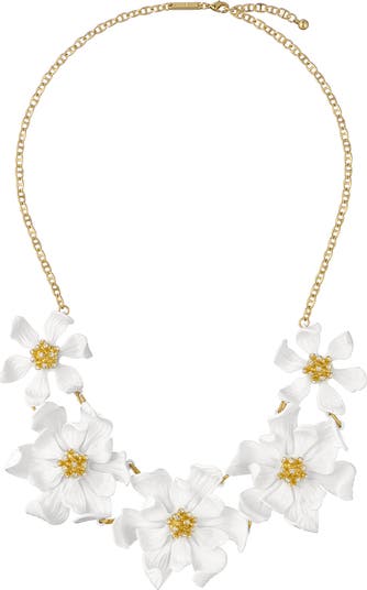 A row of pretty flower-shaped charms adorned with bright enamel and shimmery crystals bring statement-making style to a delicate chain necklace done in a high-shine finish.