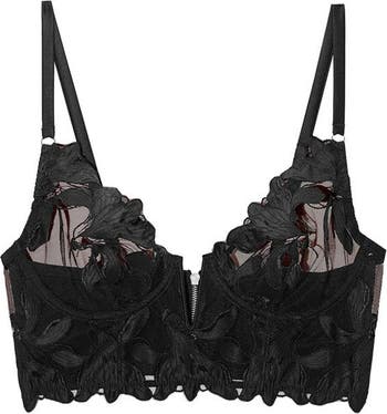 Tonal embroidery gives a hint of mystery to this sultry underwire bra made with soft satin trim and a subtly edgy zipper in the back.
