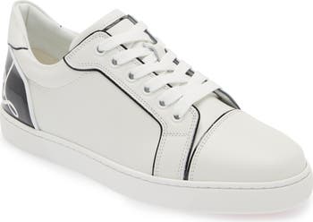 A signature logo details the glossy heel counter and Louboutin-red inset at the sole of this leather sneaker framed with contrast piping.