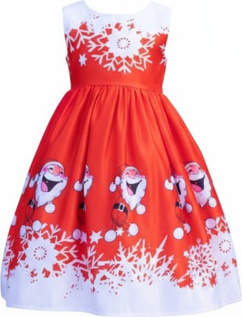 - Sleeveless a-line dress with elastic waistband, and snowflake and smiling Santa graphic designs on the collar, skirt, and hem