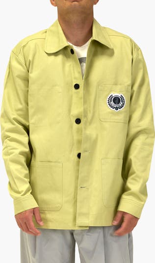 An embroidered logo patch at one of the chest pockets lends a vintage-meets-modern vibe to a relaxed-fit workwear jacket made from durable cotton twill.