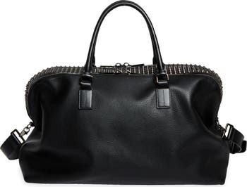 Signature spiky studs bristle the topline of a roomy duffle bag crafted in Italy from heavily pebbled calfskin. Rolled top handles and a removable shoulder strap offer carrying options, while pops of Louboutin-red complete the look.