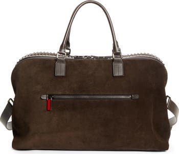 Signature spiky studs bristle the topline of a roomy duffle-style bag crafted in Italy from velvety calfskin suede. Rolled top handles and a removable shoulder strap offer carrying options, while pops of Louboutin-red complete the look.