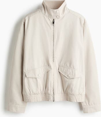 Jacket in woven fabric featuring a funnel collar with press-studs. Concealed zip down the front, flap front pockets with a press-stud and long sleeves with a slit and a press-stud at the cuffs. Smocked elastication at the hem. Lined.