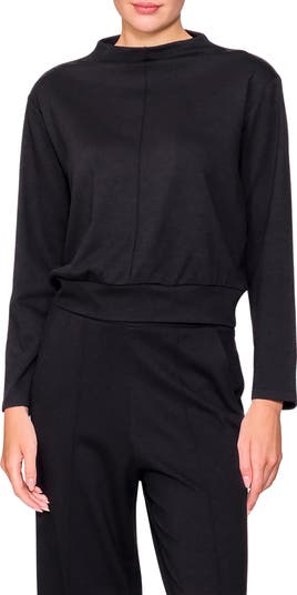 Raised seaming at the center punctuates a soft knit pullover that features a funnel neck and a banded waist for a blousony fit.