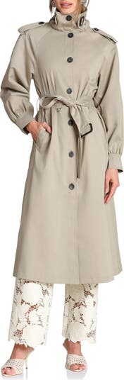 A novel neckline silhouette freshens up a classic trench cut from a cotton-enriched fabric.