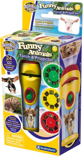 TORCH & PROJECTOR: FUNNY ANIMALS TORCH - This fantastic projector torch projects hilarious images of funny animals around your room. View the images on your walls and ceilings including kittens, goats, lions, flamingos, owls, and more –a great bedtime companion to make going to sleep more fun. The torch comes with three slide discs and a total of 24 color animal photographs. Swap and change the slides in the torch easily then rotate the disc round to view the fantastic color images which project up to one meter wide. Images are easily focused by turning the lens head. This product can be used as a normal torch without the slides in place and is great for keeping on bedside tables to give comfort to children during the night. The torch measures 12cm long and 4cm in diameter. A perfect, fun yet educational, gift for boys and girls who are interested in Animals. Now that kids grow out of toys earlier and earlier, torches will appeal to kids into their tween and teen years. Ideal for pajama parties and sleepovers. Remove the tag to activate. Secure battery cover. If the disc is dusty, clean it with a soft cloth. INCLUDES: 2 AAA Batteries.