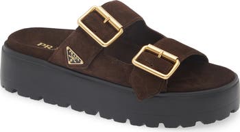 Suede straps detailed with golden roller buckles and Prada's iconic logo offer a custom, secure fit in this platform sandal made for comfort with a molded footbed and lugged sole.