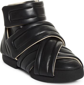 Originally introduced in the spring '11 collection, the Future sneaker returns to the spring '26 runway with its signature sculptural construction. A mid-top silhouette is wrapped in piping-outlined, padded panels that wrap around the foot in a continuous gesture. The result is a subversive, architectural form that blurs footwear and object.