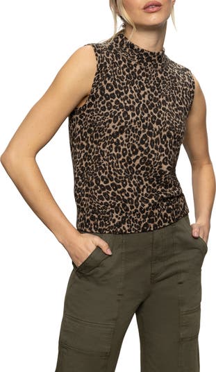 Keep cozy during sweater season in this sleeveless leopard-printed pullover knit from ultrafuzzy yarns and topped with a sleek mock neckline.