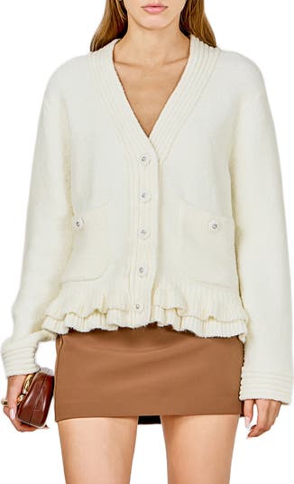 Sweater weather is so much sweeter in this wool-kissed cardigan decorated with crystal-centered buttons and tiered ruffles.