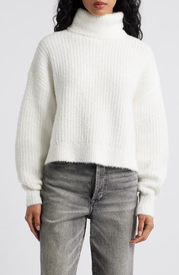 Eyelash-like tufts texture a fun-to-wear turtleneck sweater knit in a laid-back slouchy profile.