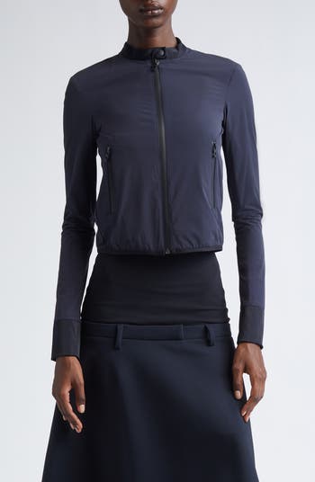 The label’s sport pulse is distilled into this runway-featured jacket cut in smooth, stretchy fabric with a sleek zip front and pared-back lines. A low-profile collar and clean seaming sculpt a modern frame that moves with you.