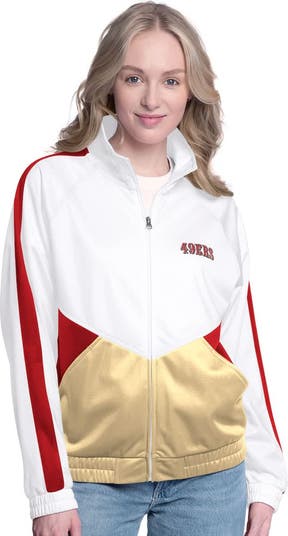 Show your San Francisco 49ers spirit with this G-III 4Her by Carl Banks Rally Rhinestone Full-Zip Track Jacket. This stylish jacket features bold sleeve stripes, screen printed graphics and a color rhinestone team logo on the back, making it a standout piece in your wardrobe. Its lightweight polyester construction and comfortable fit make it perfect for mild weather, whether you're cheering for the San Francisco 49ers from the stands or running errands around town.