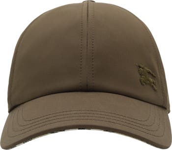A baseball cap in cotton nylon gabardine, accented with beachgrass beige Burberry Check at the strap and under the brim. Part of our Gabardine Capsule, the design pays homage to the house’s iconic signature – a revolutionary fabric invented by Thomas Burberry, worn by explorers and everyday adventurers alike.||Adjustable B buckle strap|Embroidered Equestrian Knight Design at front