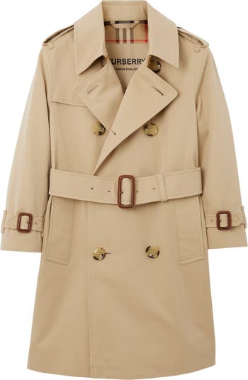 Inspired by our heritage styles, a trench coat in shower-resistant cotton gabardine. Inside is Burberry Check cotton, used to line our coats since the 1920s.||Double-breasted button closure| Epaulettes |Age 3: belt without prong, belted cuffs without prong|Ages 4-14: Hook-and-eye collar closure, belt with prong, belted cuffs|Side welt pockets |Back button vent |Burberry Check lining and undercollar