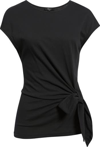 Solid-color staple tops are always welcome, especially when a graceful style point, like ruching and a side tie, come along with the look.