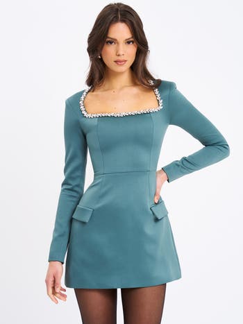 Gabella Long Sleeve A-line Mini Dress with Crystal Trim