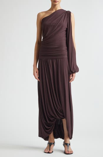 This flowing runway-featured gown is styled from gauzy jersey for its ideal combination of drape and cling that's demonstrated through ruching, gathers, slits and various asymmetries.