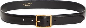 A gilded buckle closes a smooth leather belt that will finish lots of looks.