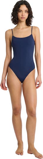 - It has a scooped neckline framed by slim straps, a high-cut leg and an open back.