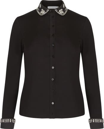 The GABRIELLA shirt is a refined expression of understated elegance, crafted from sumptuous black pima jersey cotton that drapes with effortless ease. Defined by a softly rounded collar and a sleek center button placket, the design is elevated by French cuffs—tailored to accommodate cufflinks and add a personalized touch of sophistication. Crystals delicately embellish the collar and cuffs, introducing a subtle sparkle that enhances the shirt’s quiet allure. Balancing classic structure with luminous detail, the GABRIELA shirt embodies a modern sensibility infused with timeless grace—perfect for those who appreciate refined craftsmanship and a whisper of glamour.