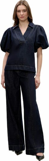 The this denim top in deep sea wash brings a modern twist to classic denim styling. This short-sleeve top features refined topstitching details that enhance its structured design, while the fully lined sleeves provide added comfort.