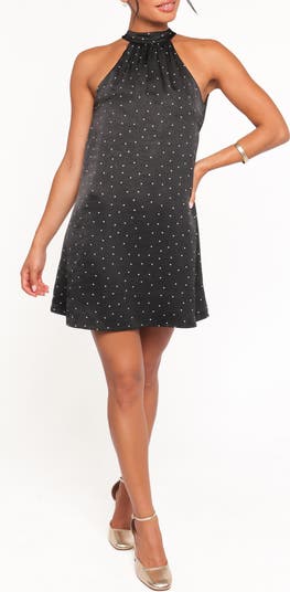 Turn heads in this sassy polka dot minidress, where hammered satin and a striking halter design take your look to the next level.
