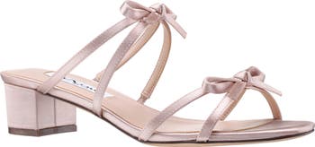 Delicate bows detail the straps of an elegant slide sandal set on a cushioned footbed and wrapped block heel.