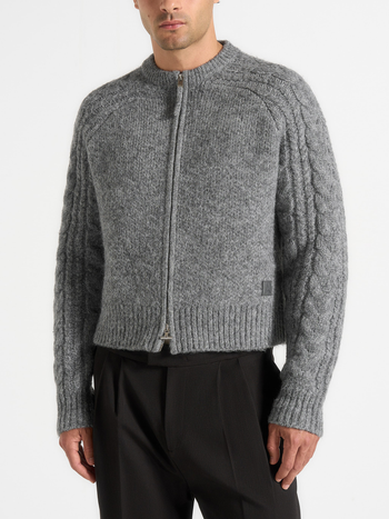 Crafted from high-quality knit fabric, this piece offers a soft, elevated feel with a refined finish. Cable knit detailing at the shoulders introduces texture and dimension, adding subtle depth to a clean silhouette. A dual-zip fastening completes the design, allowing for versatile styling and everyday ease.