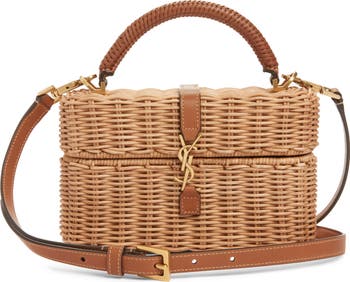 This small, structured vanity case is destination-ready while simultaneously evoking a vintage, coastal aesthetic in tightly woven wicker with polished YSL hardware.