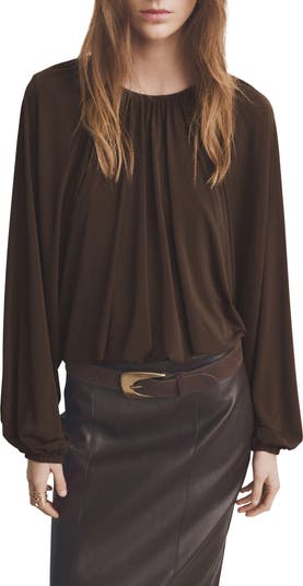 Soft draping defines this fine-knit top, where gathers at the neckline create a luxurious, fluid fall through the straight silhouette. Balloon sleeves and a bubble hem enhance the sense of languid sophistication, making it an elevated everyday piece.