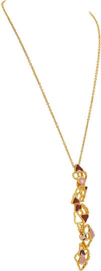 The Gaia Necklace is handcrafted in 22k gold-plated brass with purple enamel accents. A textured pendant hangs from a delicate adjustable chain, creating a statement that’s noticeable without feeling heavy. Each piece carries subtle variations that reflect its handcrafted nature.