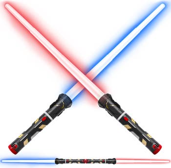 2 IN 1 LED LIGHT UP SABER SWORDS SET: Harness the power of the Force with the Starfire glow in the dark light sword set with bright color-changing LEDs and FX sound; includes 2 expandable and retractable light swords that easily connect together to create 1 double-edged mega saber sword for epic galaxy battles COLOR CHANGING LEDS:Fight in a galactic war with family and friends and watch the vibrant LEDs flash every time you cross swords. Pick-A-Side Mode: Quick press the button on the realistic sword handle to switch between 3 colors: red, blue, or purple EXPANDABLE AND RETRACTABLE SWORDS: Prepare for battle, grab the easy to grip handle of the toy saber and swing to expand these light up toy swords from 17.2” to 31” long; the translucent LED blades are nontoxic and safe for kids ages 6+ INTERACTIVE SOUND FX: These lightweight and child safe space swords have realistic light sword sound effects when turned on. The automatic Battle Flash Mode plays galactic battle sound effects and flashes colors upon on contact GALACTIC COSTUME AND COSPLAY ACCESSORY: Complete your costume or Star Warrior cosplay attire with these Galaxy Light Swords; includes 2 durable light up swords (requires 3 AAA size batteries - not included), 1 connector, 1 screwdriver, and user manual. Equipped with a battery saving function that turns off the sword between color changes