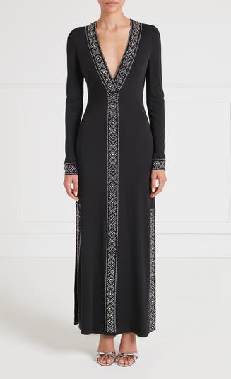 A striking full-length gown crafted from sleek black jersey, embellished with precision hot-fix detailing that traces the neckline, cuffs, and front bodice. The deep V-neckline elongates the silhouette, while long sleeves and side slits create a graceful sense of movement. Drawing inspiration from 19th-century embroidery artistry, this design transforms heritage motifs through a contemporary lens — blending timeless craftsmanship with modern sophistication.