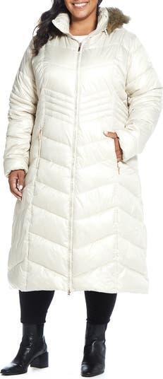 Stay warm in any weather with a long A-line puffer jacket featuring ruched side panels, chevron quilting and a removable hood lined with faux fur.