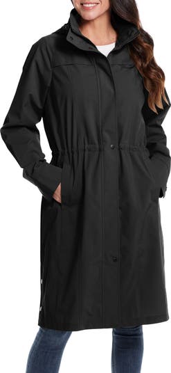 A knee-length silhouette and removable, adjustable hood lend extra coverage to this water-resistant raincoat fashioned with an internal drawstring waist.