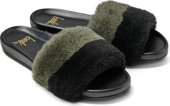 A plush shearling strap provides a luxe finish for this updated slide sandal complete with a cushioned, arch-supporting footbed.
