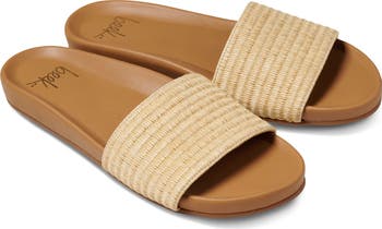 A casual slide sandal goes hard on the warm-weather vibes with a woven raffia strap, while a memory foam-cushioned footbed with built-in arch support keeps you comfortable through every adventure.