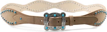 An ornately textured buckle and vibrant turquoise-hued studs lend Western flair to a softly scalloped belt crafted from rich faux suede.