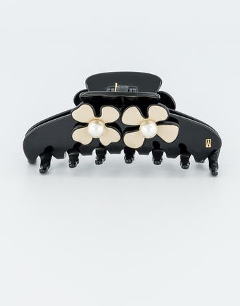- Handmade in France, from acetate, a material with a natural heirloom, born from cotton flower and wooden pulp hair friendly at heart. It is adorned with Swarovski pearls.
