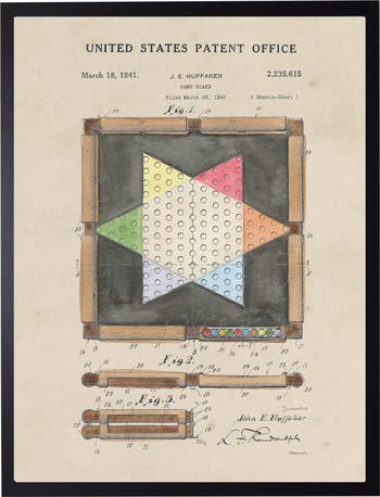 This vintage-inspired print, framed in a black wooden frame, features a game board patent. Sized at 16 inches by 20 inches, this made in the USA frame makes for a beautiful addition to any wall.
