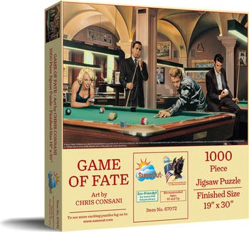 Step into the irresistible retro Americana world with the Game of Fate 1000 Piece Jigsaw Puzzle from SunsOut, masterfully crafted by the acclaimed artist Chris Consani. This engaging puzzle beautifully fuses nostalgia, style, and the charm of a bygone era into a 19" x 30" configuration, providing hours of enjoyable entertainment. Known for durability and quality, each SunsOut puzzle piece is made from high-quality recycled cardboard and die-cut meticulously in the USA for a perfect fit every time. This reduces frustration while ensuring progress, making for a satisfying relaxation experience for adults. SunsOut holds a firm commitment to eco-friendly practices, using soy-based inks and premium recycled materials for their products, reflecting our dedication to sustainability and excellence. As a testament to a peace of mind with your purchase, SunsOut’s outstanding customer service commitment guarantees swift resolutions for any missing or damaged pieces issues. The Game of Fate is an ideal gift for puzzle enthusiasts, regardless of their expertise level. Its captivating theme, paired with top-tier craftsmanship, makes it a remarkable addition to any puzzle collection, bearing testament to SunsOut's commitment as a woman-owned small business retaining impeccable ethos of quality and service.