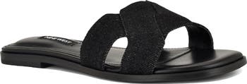Wide, interlocking straps bring subtle dimension to a slide sandal fashioned with a squared-off toe and treaded sole.