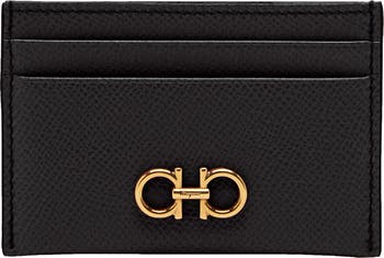 Double-Gancio hardware gleams against the pebbled calfskin leather of a card case trim enough to drop in a pocket or an evening bag.